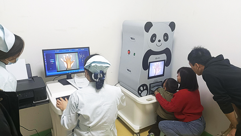 在辐射防护上,设备采用低剂量成像技术,精准控制照射范围,仅覆盖手部检测区域,搭配全封闭铅防护结构与专用防护铅帘,构建多重安全屏障,无需单独搭建铅房,既能减少不必要的辐射暴露,也能降低医疗机构场地改造投入,兼顾医护人员与儿童的双重安全。同时,设备优化曝光时长,快速完成拍摄,减少儿童等待与挪动时间,降低因动作偏移导致的重拍概率,进一步减少辐射接触;“萌企鹅”与“乖熊猫”的卡通化外观设计,弱化医疗设备的冰冷感,缓解孩子的紧张情绪,提升检测配合度。